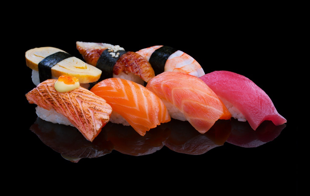 Sushi zalm, tonijn, omelet, krabstick, geflambeerd